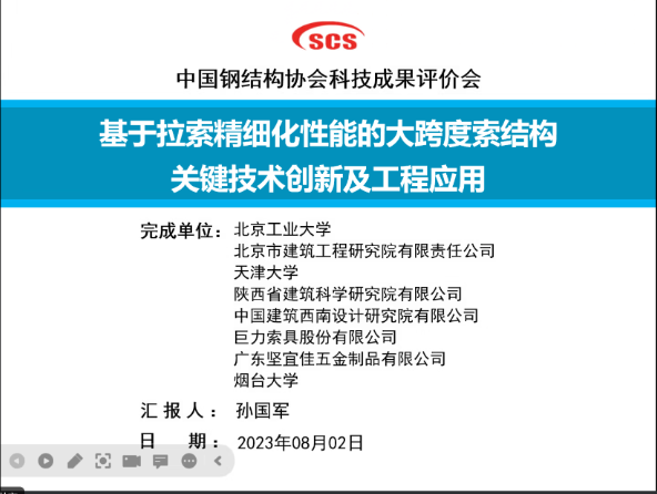 8月2日,中国钢结构协会组织召开“拉索性能精细化研究与大跨度索结构关键技术创新应用”科技成果评价视频会。该项目由北京工业大学、北京市建筑工程研究院有限责任公司、天津大学、陕西省建筑科学研究院有限公司、中国建筑西南设计研究院有限公司、巨力索具股份有限公司、广东坚宜佳五金制品有限公司、烟台大学等单位共同完成。评价会邀请全国工程勘察设计大师、中国建筑标准设计研究院有......