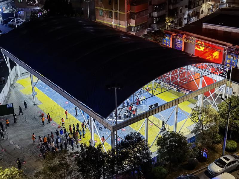 在深圳龙华区观湖街道松元厦社区党群服务中心旁的文化广场上,居民们正有条不紊排队等候核酸检测,在他们的头顶上,一顶大棚稳稳而立,为医护人员、工作人员和居民遮风挡雨。...