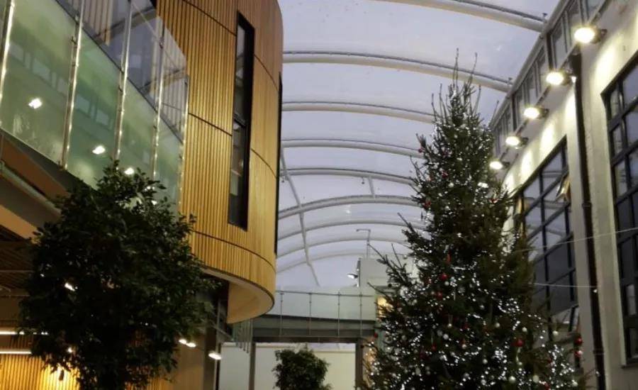 这是一个外部庭院,一个三层膜结构缓冲屋顶地坐落在法尔茅斯大学校园的中心,为学生提供一个明亮和开放的空间,一年四季都不受天气影响。...