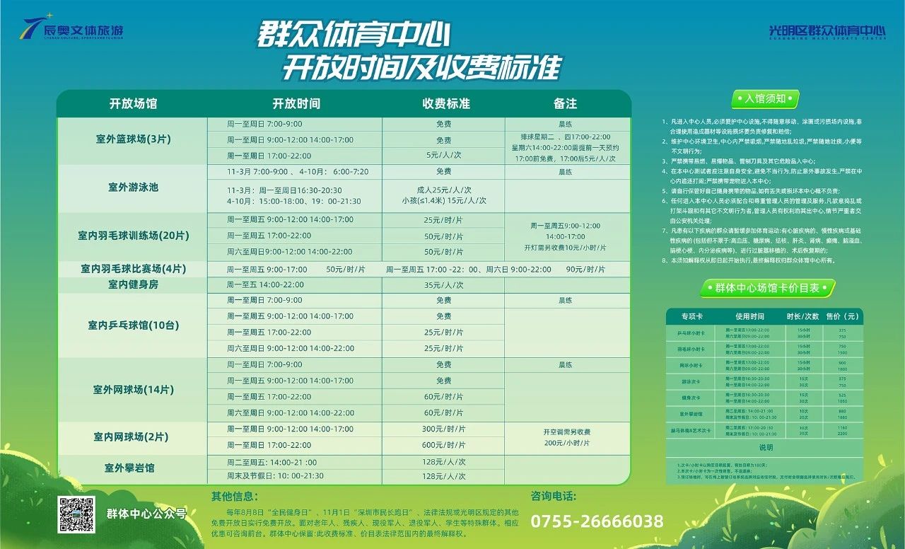 说明:1、一卡通和惠民一卡通为提前消费充值卡,享受会员价优惠,一经充值不做退还,可反复充值。2、将推出体育中心会员消费积分兑换办法,提供更多的优惠,提前查阅场馆发布的通知。3、场地使用超过30分钟(含30分钟)按一小时计费,未超过30分钟,按半小时计费。4、白天(除天气原因外)场地灯光费10元/片/时。光明区群众体育中心位于深圳市光明区光侨路与华夏路交会处,光明新城公园北......