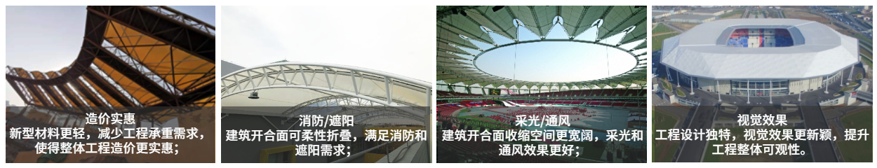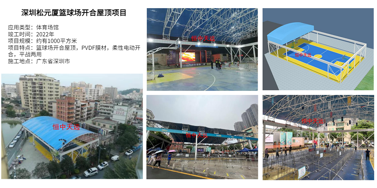 在开合屋顶/开合屋盖建筑工程领域,恒中天远通过汇集建筑、结构、机械、电气、幕墙、装饰、消防、移动互联网等综合专业人才,打破海外技术垄断,创造性开辟出新一代智能开合屋盖技术,填补了国内建筑开合屋盖的发展需求。比如:采用智能开合屋盖的场馆,能在室内空间和室外环境之间相互转换。同时也逐渐运用到如商场开合屋盖等其他领域,拥有巨大的发展前景。恒中天远智能开合屋盖以其专业性、安全性、流畅性、易用性,成功使得屋盖的发展走向科技化、智能化。代表案例:江苏无锡全开合网球场工程项目、深圳松元厦篮球场开合屋顶工程项目等。